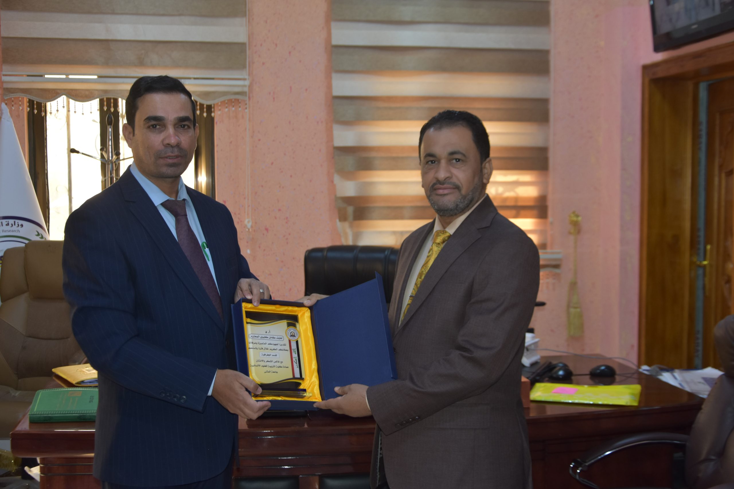 السيد عميد كلية التربية للعلوم الانسانية الاستاذ الدكتور باسم خيري خضير يثمن جهود الاستاذ الدكتور لطيف كامل كليوي بمناسبة انتهاء تكليفة برئاسة قسم الجغرافيا ،ويبارك للأستاذ الدكتور يحيى عبد الحسن فليح تكليفة برئاسة القسم .